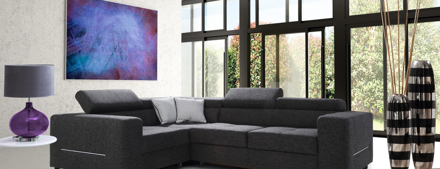 PRZYKŁAD: narożnik FABIO ubrany w dobrej jakości czarną tkaninę. mocną i trwałą. Jego znakiem rozpoznawczym jest umieszczony na bokach mebla element dekoracyjny w postaci metalowej, chromowanej listwy.